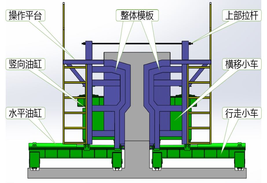 液壓箱梁模板主要由外模、行走小車及液壓系統(tǒng)組成。行走小車及液壓系統(tǒng)實(shí)現(xiàn)外模的自動(dòng)開合。